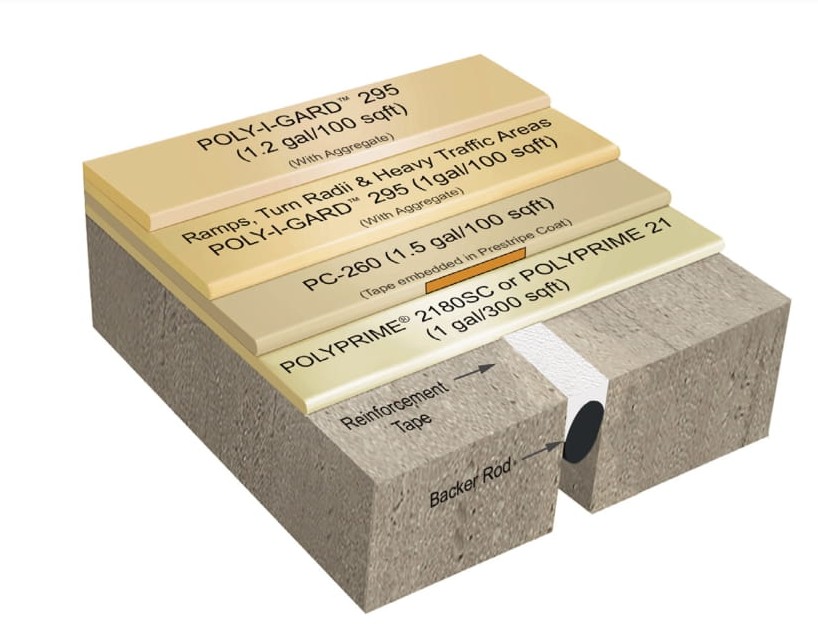 The Poly-I-Gard™ 575FC (Fast Cure) Vehicular Traffic Deck System is a very fast setting, rapid curing, 100% solids, polyurethane/polyurea, liquid applied, chemically-cured waterproofing coating system. The system utilizes a twocomponent epoxy primer, a two-component, non-gassing, thermal stable elastomeric basecoat, and a two-component, solvent free, hybrid aliphatic polyurea topcoat.